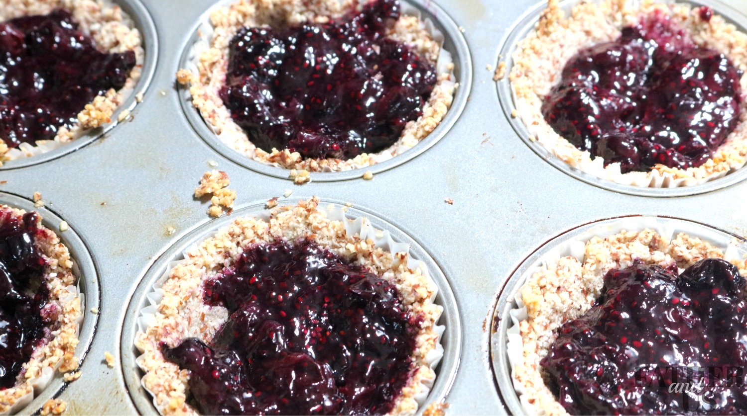 - Line a muffin tin with inserts and divide the almond mixture evenly into six tins. It will look like more than you need but you want the crust to be thick so it doesn’t fall apart.